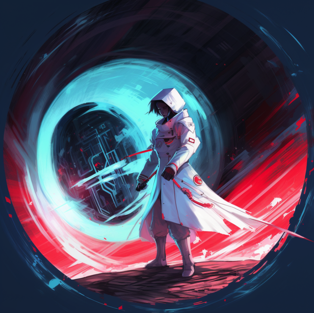 A man in a white costume surrounded by a huge disc, looks, low angle view, nightcore style, dark cyan and crimson, Mecha anime, futuristic color wave, nightmare, intricate.