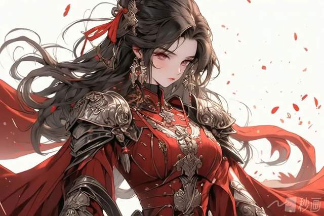 二次元,中国古代少年将军,女性,目光锐利,轻甲,劲装,暗红色布料,银色花纹,护肩,护腕,玉佩。
