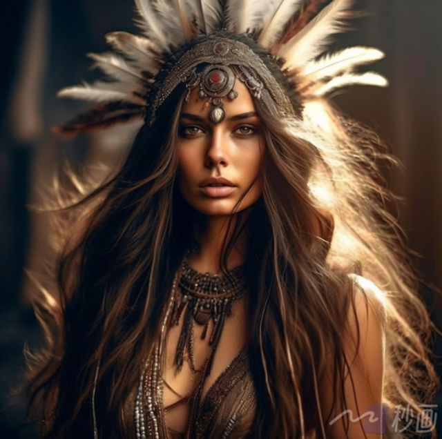 一位美丽的异域女子,蓬松飞扬的长发,印第安风格头饰,金属风格,逆光,皮肤纹理,废土风,细节感,摄影作品。