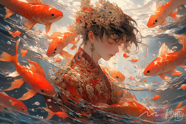 二次元,清朝古装男孩,漂浮和水下夸张的身体动态,纠缠着红色和金色的锦鲤,超现实的油画,廷德尔效应,水滴,夏天,梦幻的色彩。光折射到水中产生虹彩反射、宝石光、超细节、廷德尔效应、最佳质量。