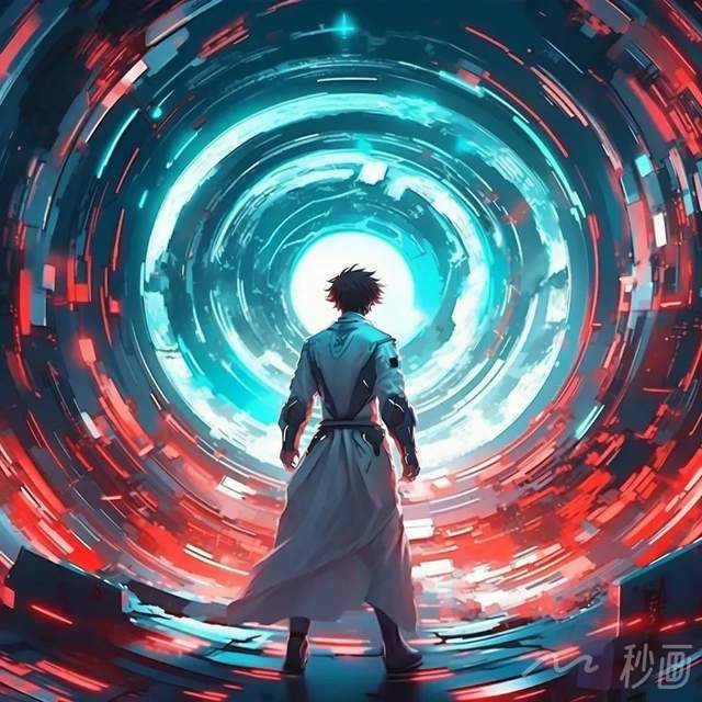 一个穿着白色服装的男人被一个巨大的圆盘包围,看起来,低角度视图,夜核风格,深青色和深红色,机甲动漫,未来派色波,噩梦,错综复杂。