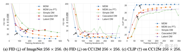对于256×256分辨率的图像,在批大小(batch size)为1024的环境下,传统扩散模型需要训练150万步,而MDM仅需39万,减少了超七成。