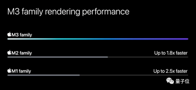 苹果和自家芯片做了个对比,结果显示M3系列比M2提升1.8倍,比M1性能提升2.5倍。