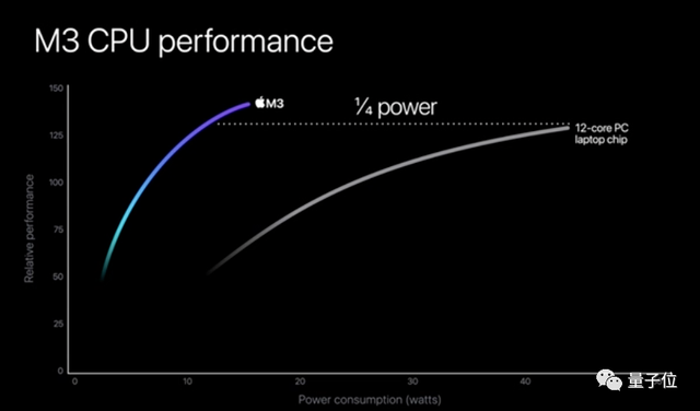 这里苹果同样没有指名道姓,暗示M3 CPU与某最新的12核PC笔电芯片相比,相同性能功耗只需25%。