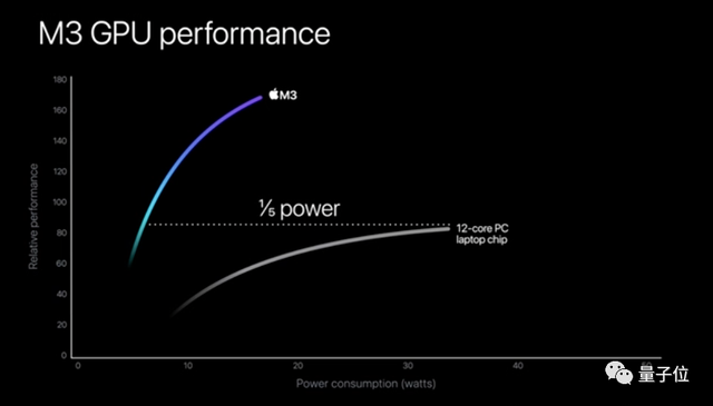这里苹果没有指名道姓,但依旧暗示M3 GPU与某最新的12核PC笔电芯片相比,相同性能只需20%的功耗: