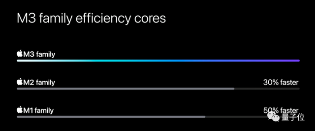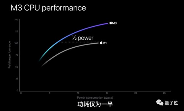 与此同时,功耗也有所降低。M3 CPU在与M1提供相同性能,功耗几乎只有之前的一半。