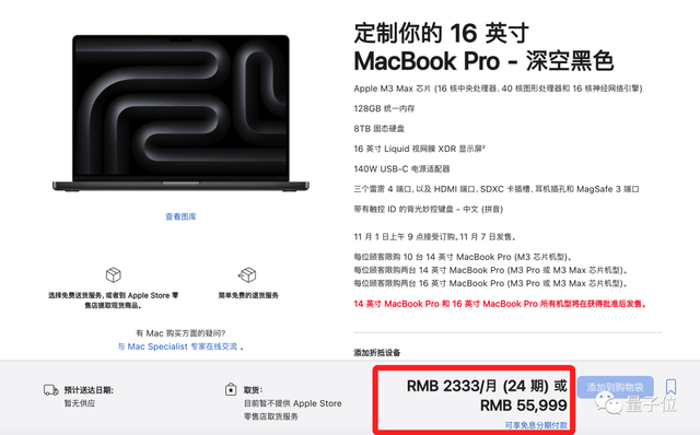 国内市场价已出,正如我们最开始提到的,搭载M3芯片的MacBook Pro起售价为12999元;而搭载M3 Max的最高配MacBook Pro,价格则高达55999元。