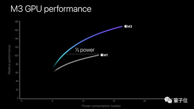 功耗也有所降低。M3 GPU在提供相同性能下,功耗几乎只有M1的一半。