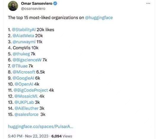 抱抱脸公布最受欢迎AI机构,ChatGLM“背后的人”国内唯一上榜