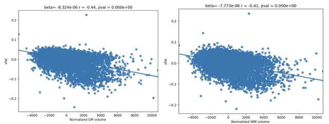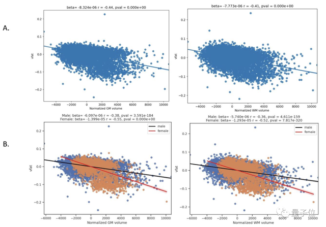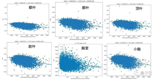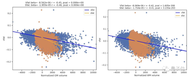 一系列数据有了,研究人员接着用线性回归、逻辑回归等统计学方法,分析了每个人的腹部脂肪体积与其大脑不同部位体积之间的量化关系。