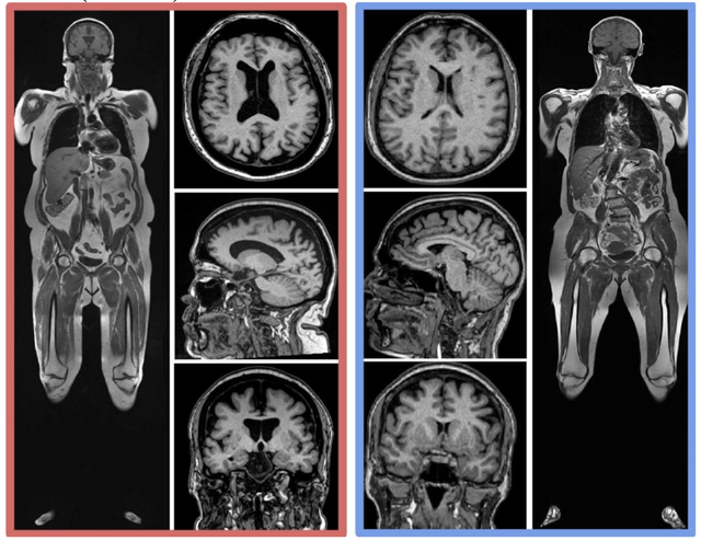 来看看两位61岁女性的核磁共振成像,左边人的内脏脂肪和皮下脂肪含量均较高,右边这位属于正常水平。可以明显看出,左边人的脑体积要比右边人的小,具体表现为脑室扩大、沟回增宽。