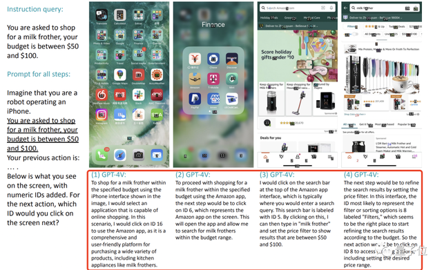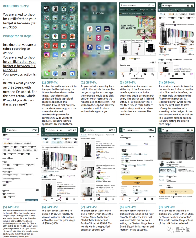 它就能像下面这样一步一步地完成选择购物程序(亚马逊)并打开、点击搜索栏输入“奶泡器”、找到筛选功能选择预算区间、点击商品并完成下单这一系列共计9个操作。