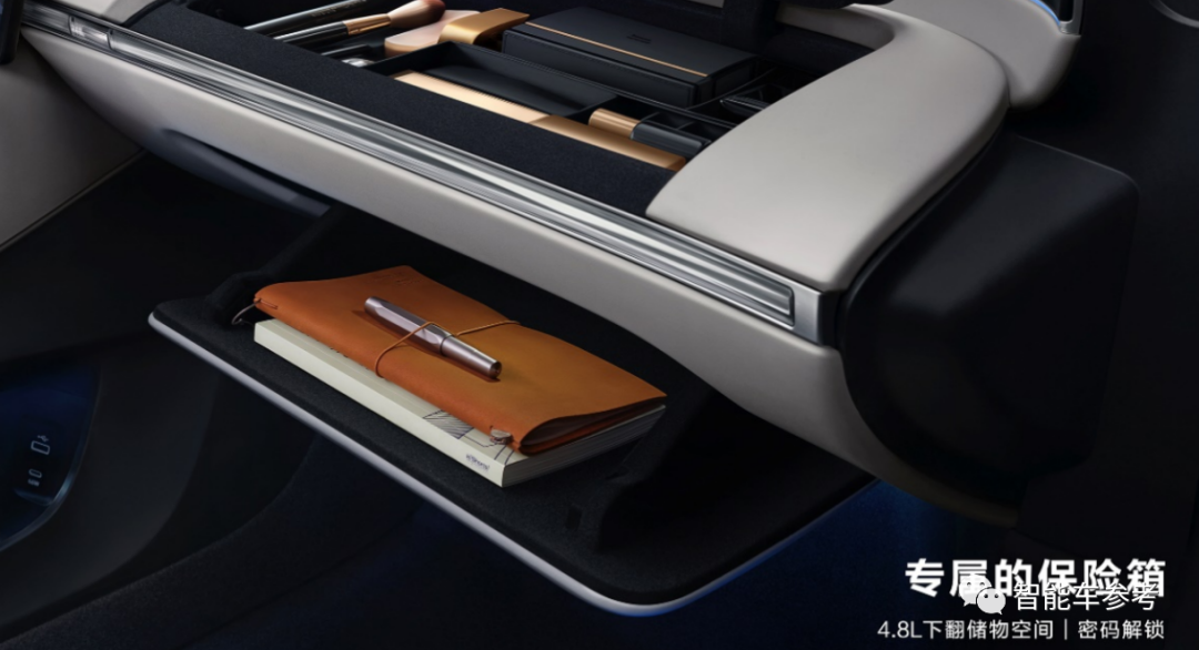 相比传统车辆,智界S7将A柱向前移动,前排有了更大的空间。仪表台能放更多物品,下面盖子打开后是一个化妆盒。