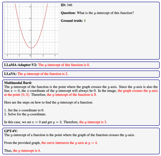 在MathVista的代数问题中,GPT-4V展现了理解图像中函数并推断其性质的出色能力,甚至超过了其他大型模型和人类。但在处理低分辨率图像和多函数图像时,GPT-4V仍面临挑战。