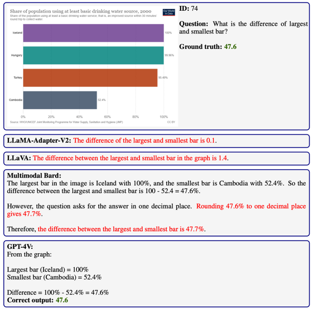 MathVista中的算术问题不仅需要准确的基础运算,还需理解多样化视觉场景。如下图所示,GPT-4V在此方面相比现有模型表现出显著的提升。