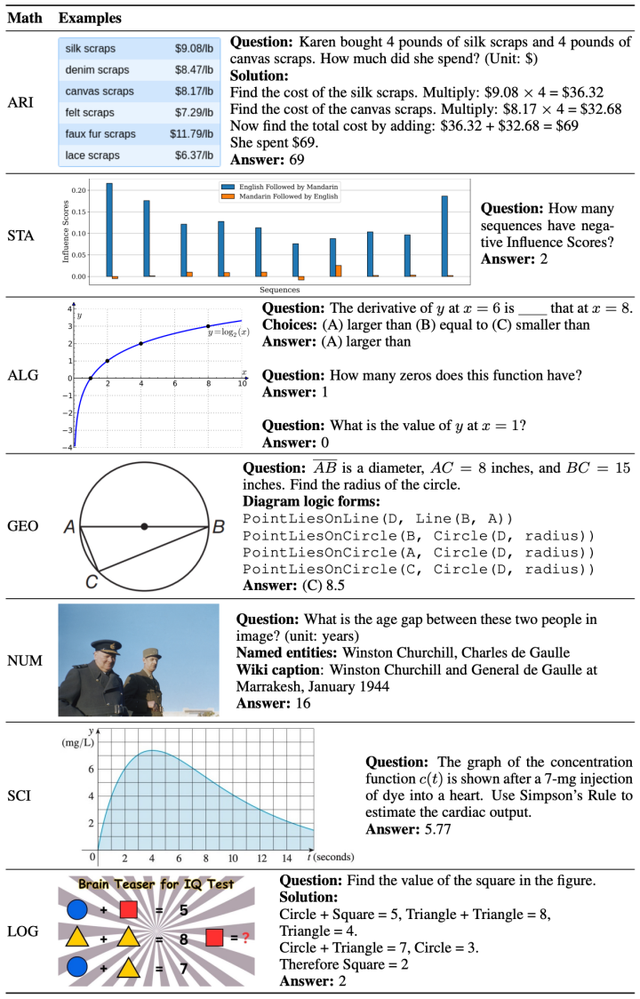 包括五大任务类别:图形问答(FQA)、几何解题(GPS)、数学应用题(MWP)、教材问答(TQA)和视觉问答(VQA)。