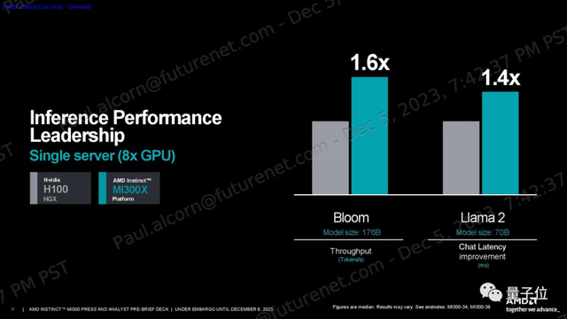 以及MI300X最多可支持700亿训练和2900亿参数的推理模型,这都比H100 HGX多一倍。