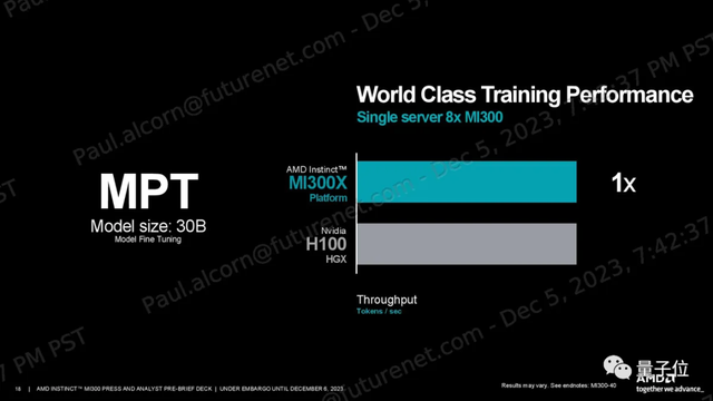 相比之下,在训练任务上,MI300X在300亿参数的MPT上的性能倒是与H100 HGX大致相同。