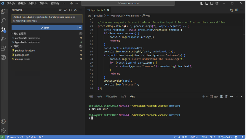 如当前工作空间存在一个或多个 Git 仓库,在[源代码管理]侧边栏面板中,会看到[魔棒图标]按钮,Raccoon 会理解您已暂存的更改,并在消息框中撰写合适的 Commit Message 建议。