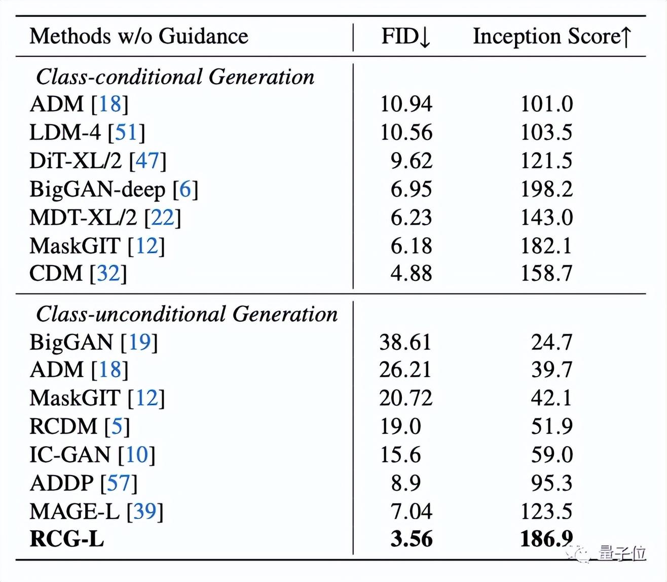 最后,在无分类器引导的情况下,RCG的成绩还能进一步提高到3.31(FID)和253.4(IS)。