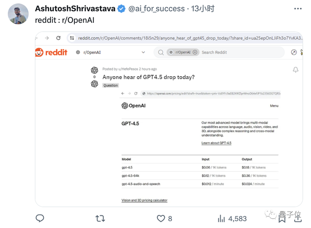 有网友指出,奥特曼否认的是这次的价格泄露,还是GPT-4.5将在12月推出这回事,目前也无法确定。