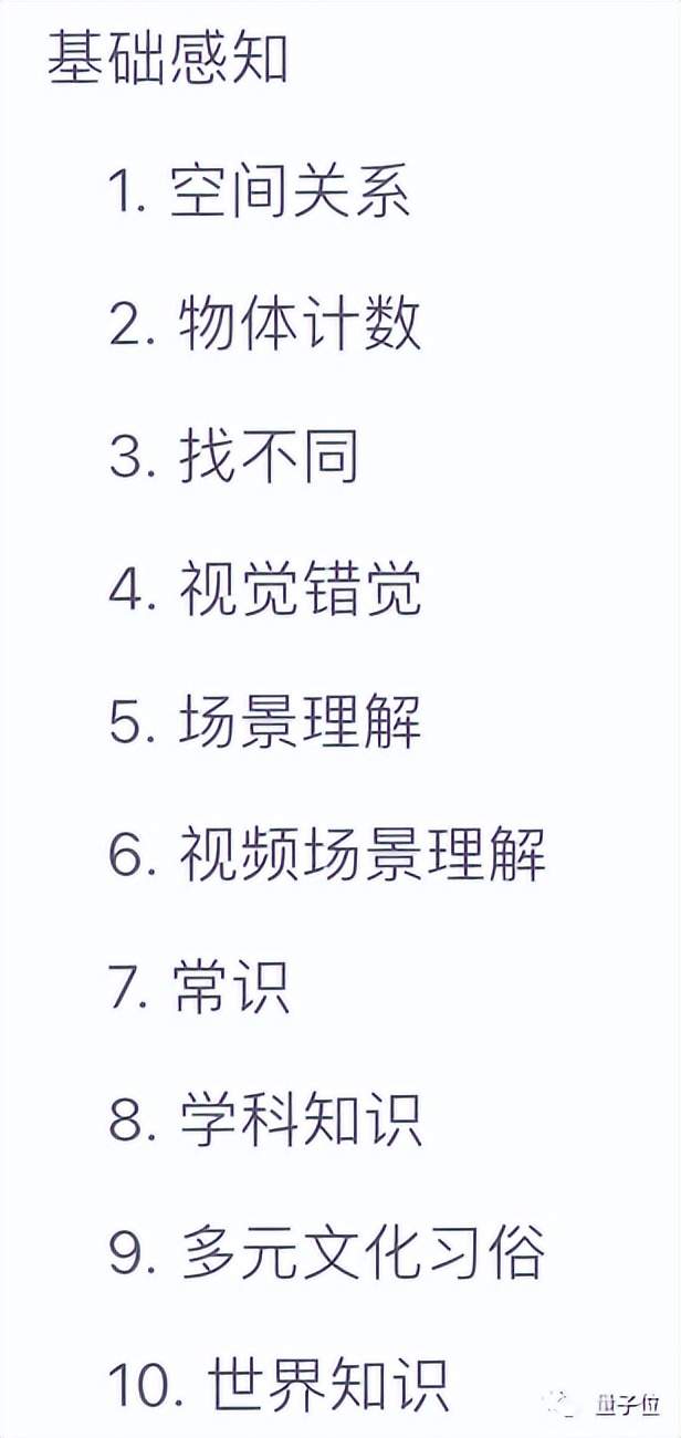 一个是感知,涵盖目标存在性判断、物体计数、位置关系、颜色判断、OCR识别、海报识别、名人识别、场景识别、地标识别和艺术品识别等。