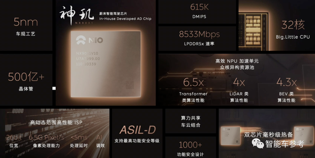 首先是智能驾驶,蔚来如今走上了软硬件全栈自研的道路,发布了自研智能驾驶专用芯片神玑NX9031。