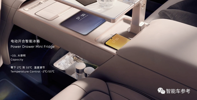 另外 ET9还在行政桥集成了电动开合的智能冰箱,10升空间,工作温度从-2°C到55°C。
