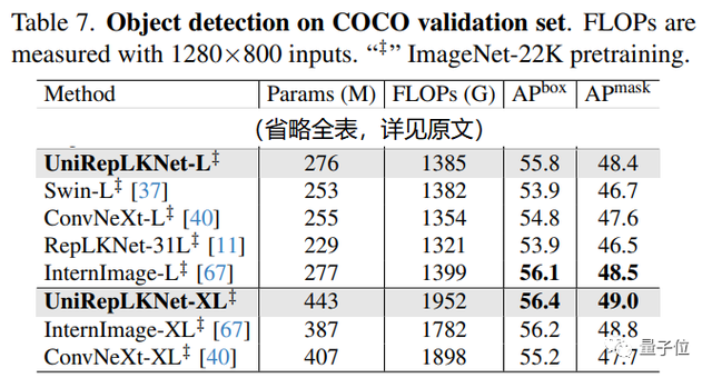 UniRepLKNet-L在COCO上不及InternImage-L,但是UniRepLKnet-XL超过了InternImage-XL。