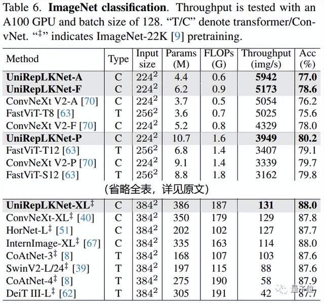 虽然大核CNN本来不是很重视ImageNet(因为图像分类任务对表征能力和感受野的要求不高,发挥不出大kernel的潜力),但UniRepLKNet还是超过了最新的诸多模型,其实际测速的结果尤为喜人。