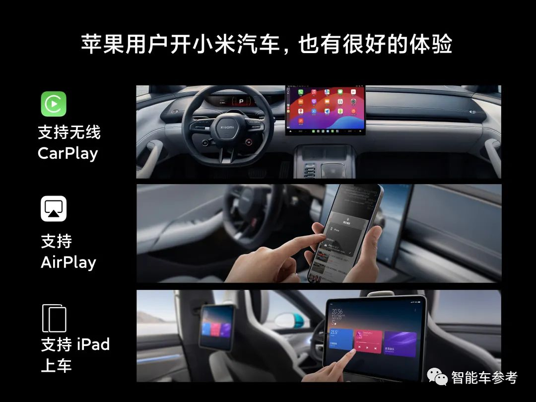 另外,小米SU7还全面支持CarPlay、AirPlay,后排拓展屏也支持使用iPad。
