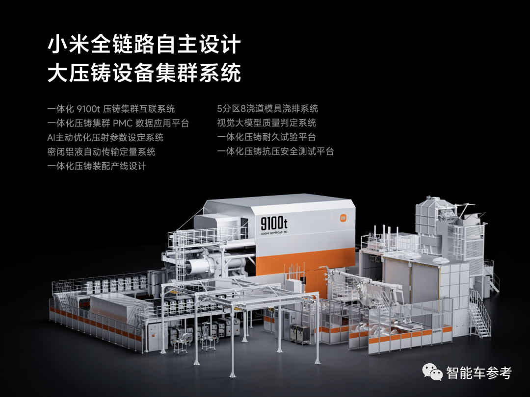 同时,小米还自研了大压铸设备集群系统,包括一体压铸机、装配产线、模具浇排系统等等,包含60个设备,能够精确控制433个工艺参数。