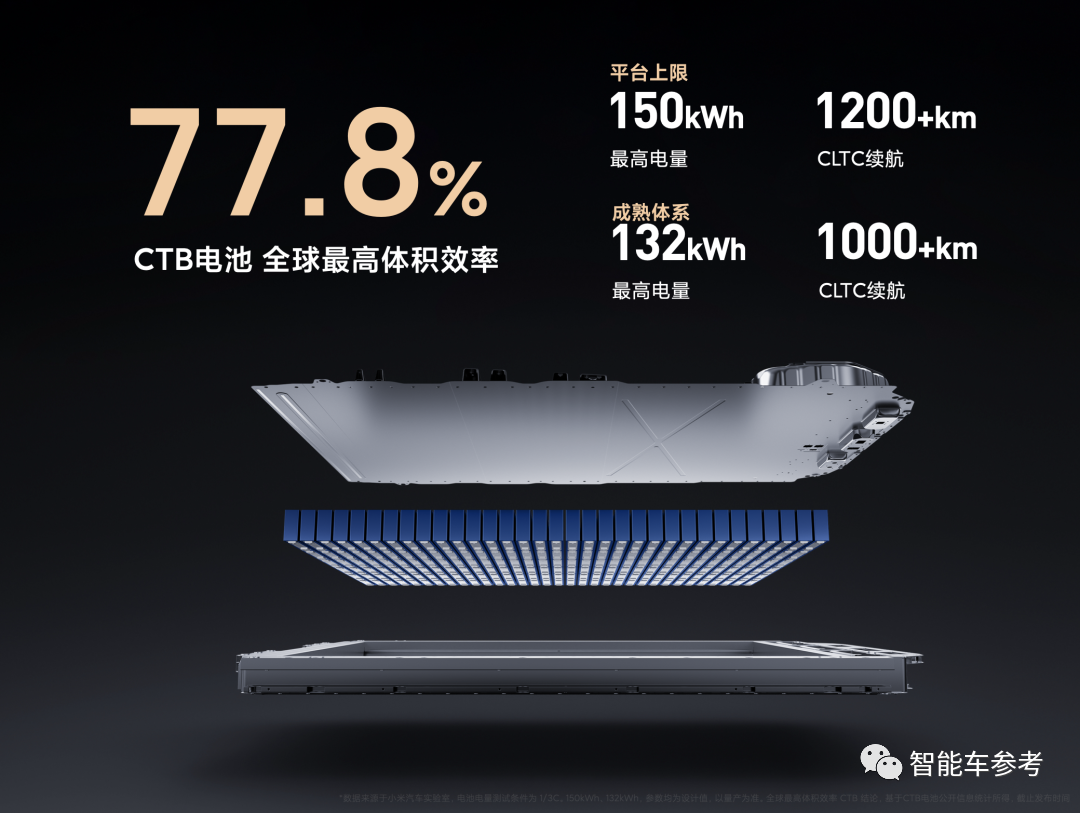 电池包采用小米自研CTB一体化电池技术(Cell to Body),电池包整合进车身,减少汽车竖向高度,增加乘车空间。