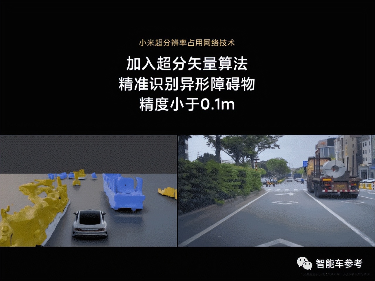 小米在占用网络中加入超分辨率的矢量算法,直接将路面上看到的所有可视物体都模拟成连续曲面的立体物,提高了识别精度,精度小于0.1m。