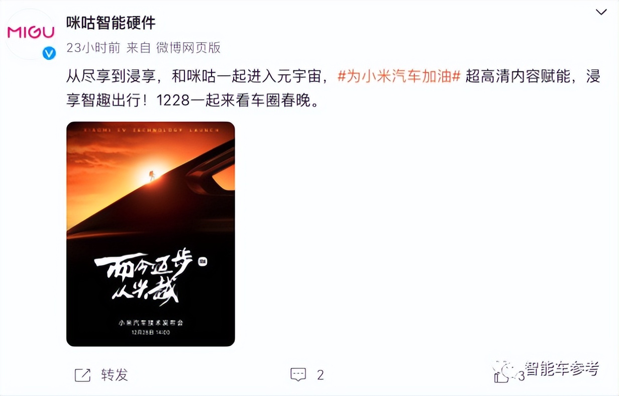 其官方微博表示,将为小米汽车“超高清内容赋能”。