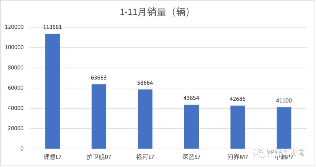 总体有6款车,SUV包括理想L7、问界M7、银河L7、深蓝S7(包括S7i)和护卫舰07,轿车有小鹏P7(包括P7i)。