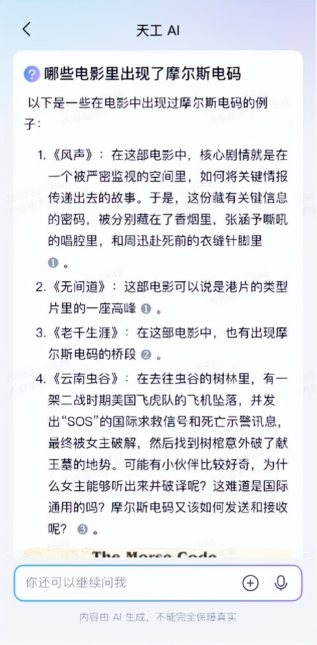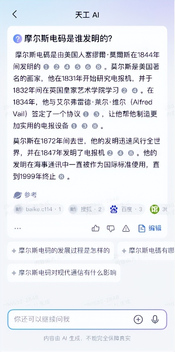 「天工AI」还可以根据上下文语义与用户展开多轮次深度对话,从而实现对于复杂问题的深入研究,“追问”功能更是能让用户可以就一个问题展开20轮次以上交互,以此展开深度探索。