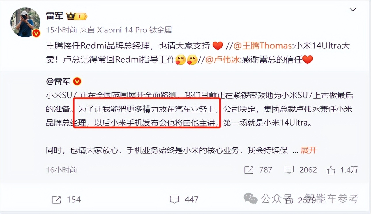 第二,雷军官宣,为了能把更多精力放在小米汽车上,小米总裁卢伟冰将兼任小米品牌总经理,今后的小米手机发布会,将由卢伟冰主讲。