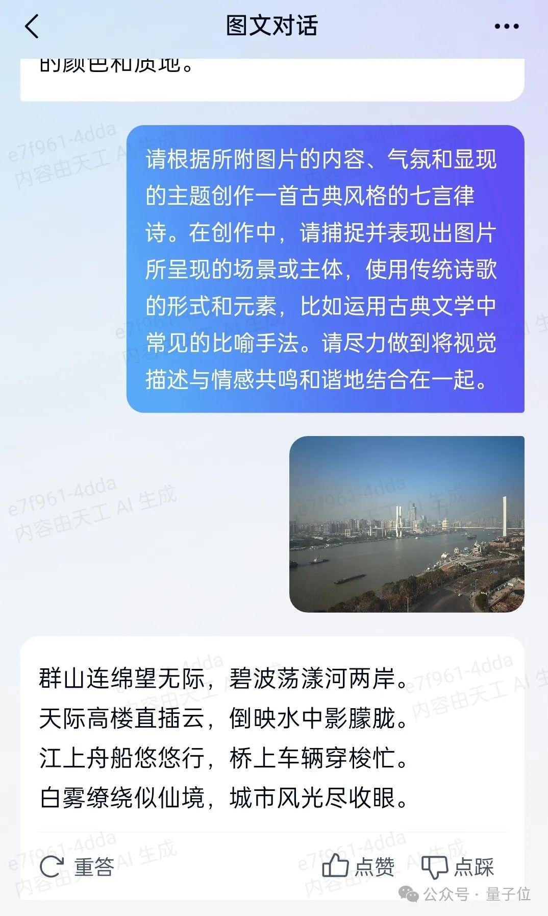 它们之中很多都具备多模态能力。比如图文对话里,可以上传一张照片让AI作诗。