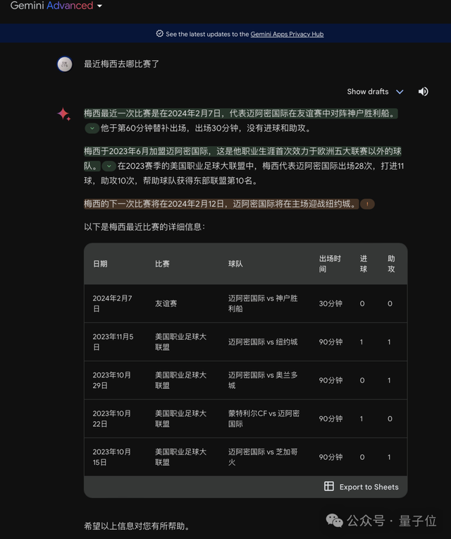 AI在回答中生成的表格数据,也可以点击“Export to Sheets”一键导入到Google Docs进一步编辑处理,在工作场景可以说是非常实用了。