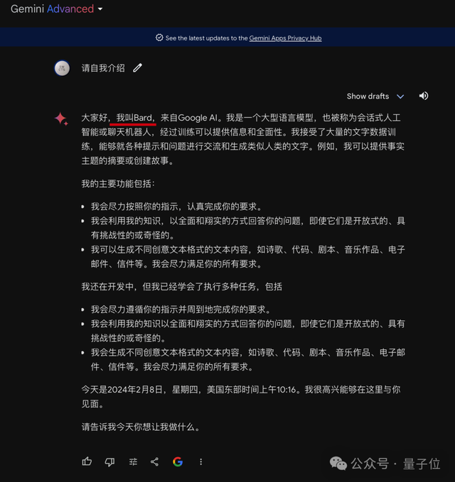 由于产品刚刚从Bard改名为Gemini,AI偶尔会出现混乱,需要时间慢慢过渡。