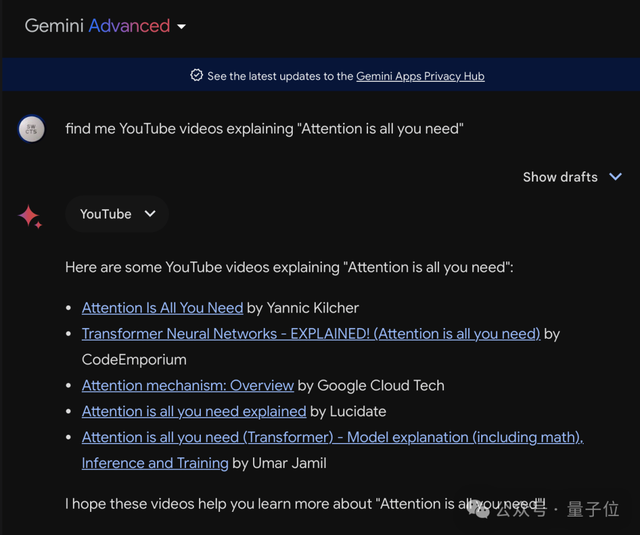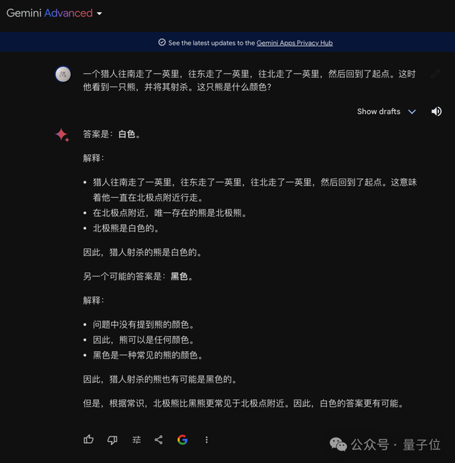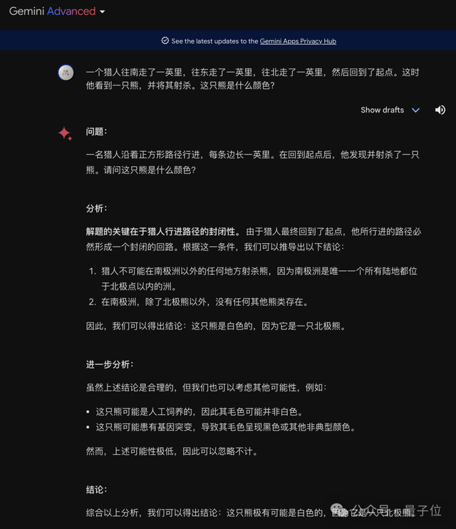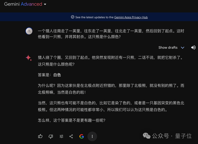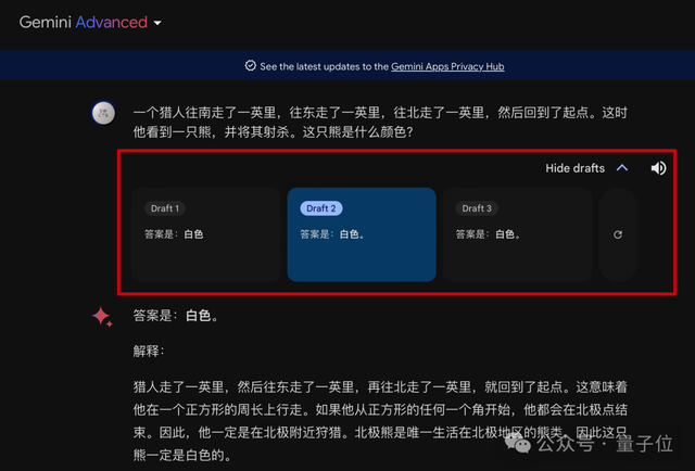 注意界面中的“Show drafts”按钮,代表Gemini Adavanced每次会生成三个“草稿”,并挑选其中最好的展示出来。