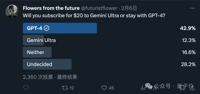 最终2360人参与,有四成坚定的继续留在GPT-4,只有12.3%选择迁移到Gemini Ultra。