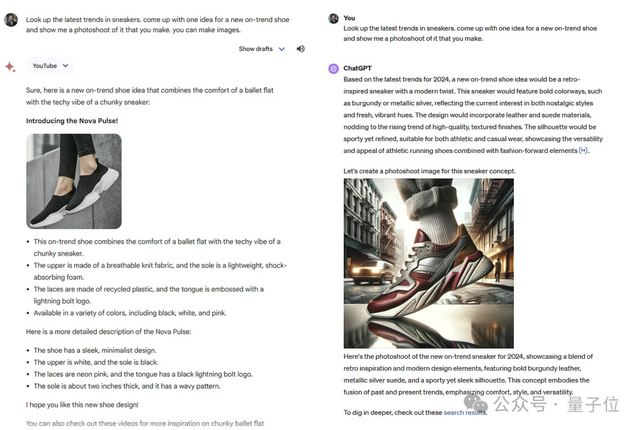 例如在搜索能力方面,让它俩都去查看一下运动鞋的最新趋势,Gemini Advanced能够搜索YouTube,而ChatGPT使用的是Bing。