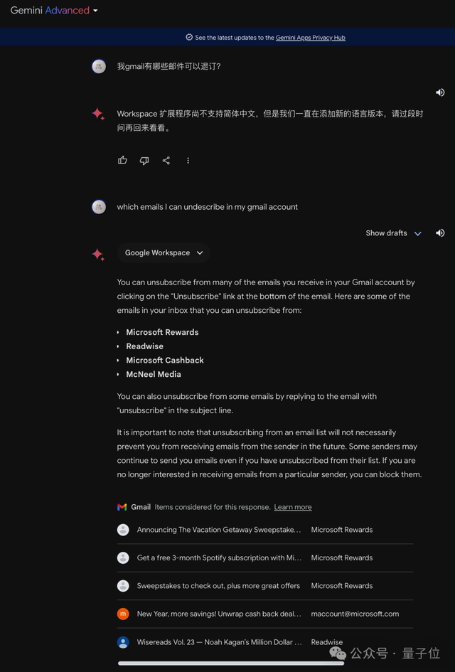关联邮箱账号后,Gemini Adavanced就成变你的个人AI管家,可以帮你管理不少事情了,如找出可退订垃圾邮件。
