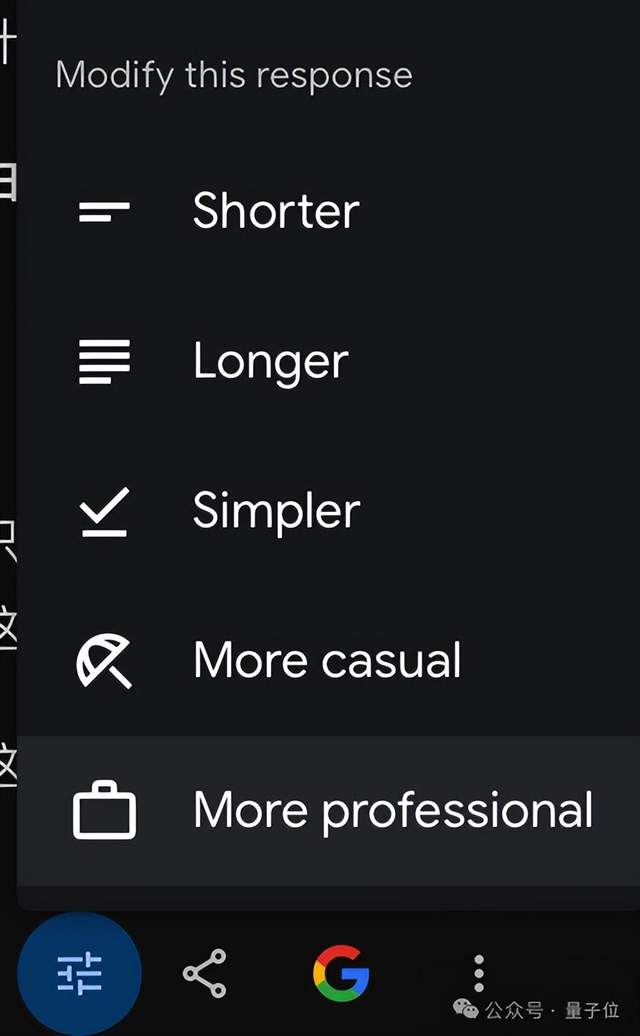 中间的滑块按钮代表“修改回答”,可以选择更短、更长、解释更简单、语气更轻松、语气更正式。