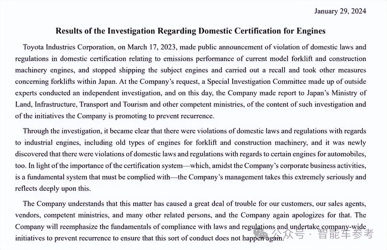 2024年1月29日,丰田汽车发布公告,称特别调查委员会认定丰田工业(TICO)在排放认证相关问题上违规。