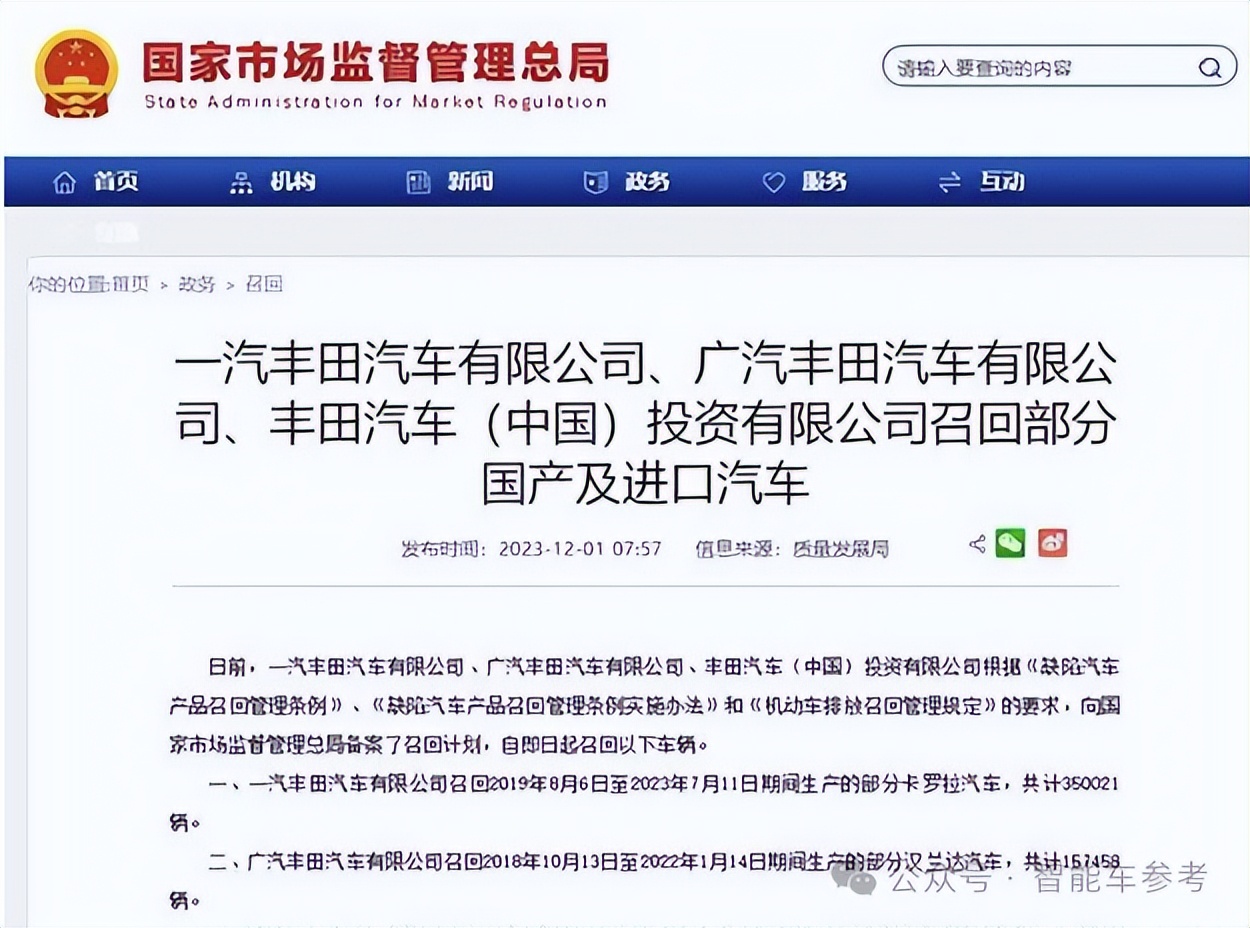 12月1日,有关部门公告显示,因为内部零件问题,燃油泵内部可能发生磨损,丰田在国内召回超101万辆汽车。