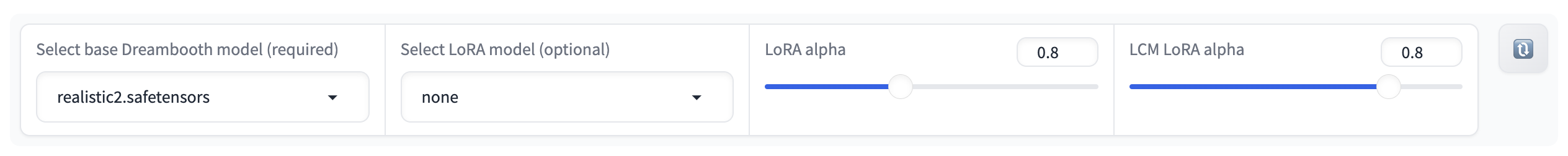 下面是一个配置区域,可以选择基础的Dreambooth模型,也可以选择LoRA模型,并通过滑动条调整LoRA alpha值等。