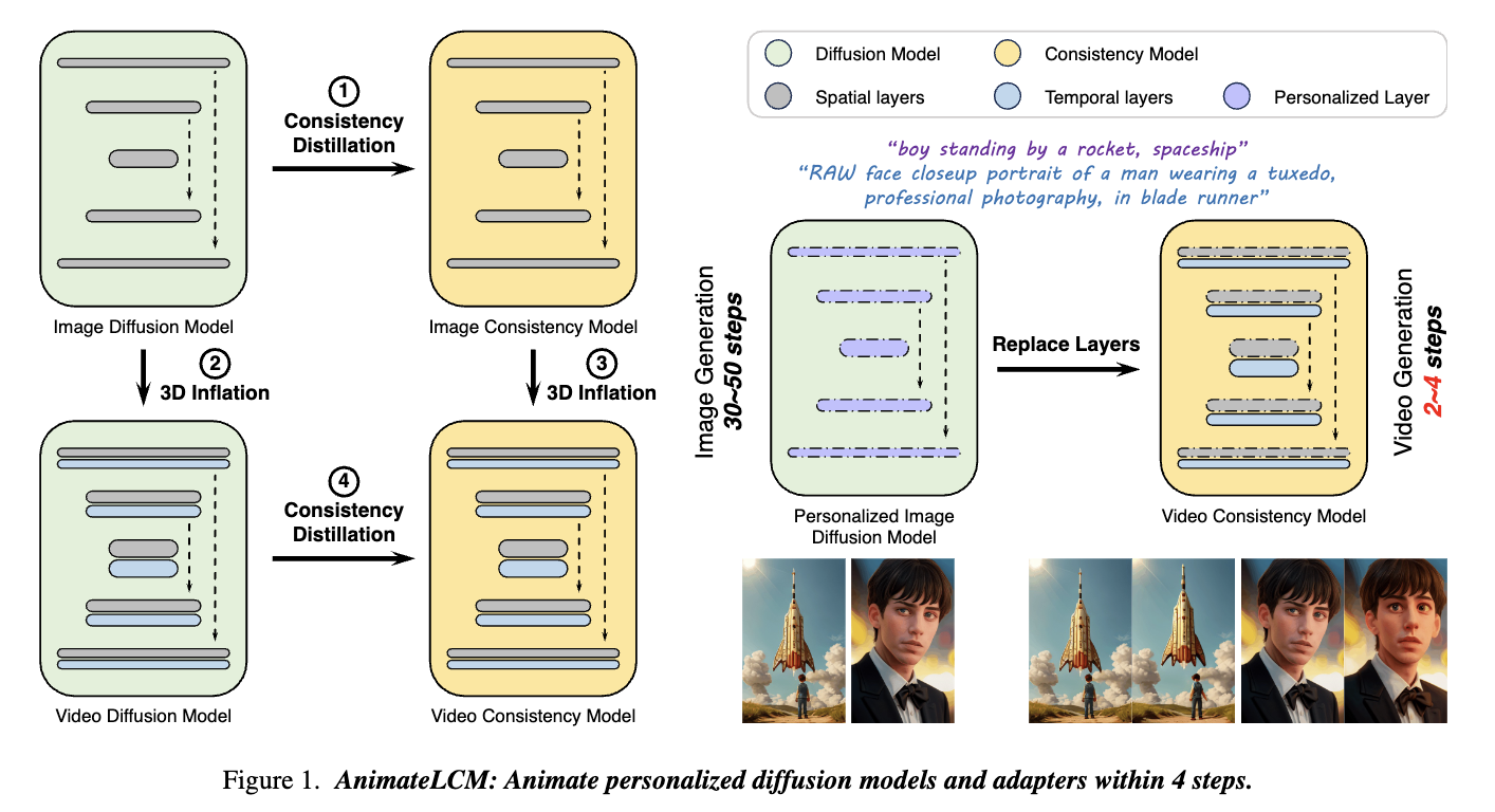 而在AnimateLCM这项工作中,研究人员受到一致性模型(CM)启发,该模型简化了预训练的图像扩散模型以减少采样所需的步骤,并在条件图像生成上成功扩展了潜在一致性模型(LCM)。